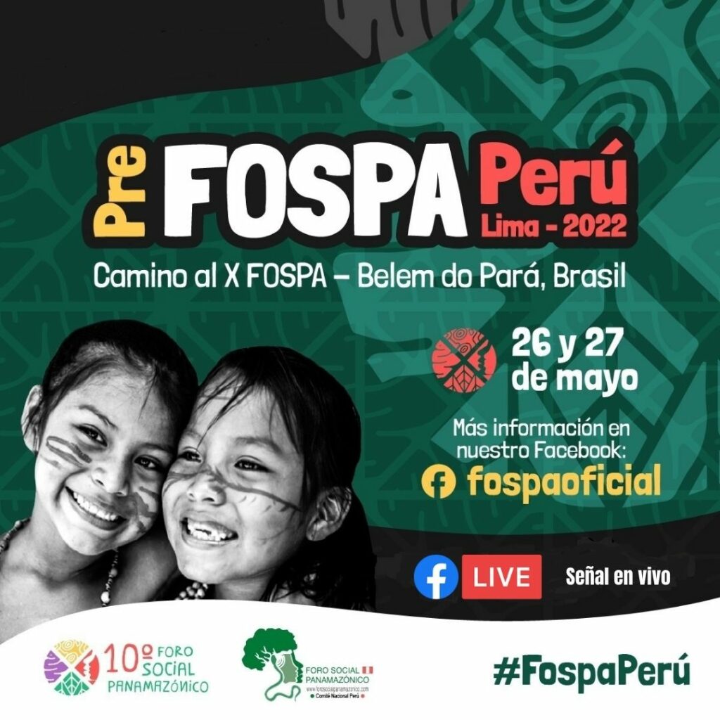 Este 26 y 27 de mayo se llevará a cabo en Lima el Pre FOSPA Perú, encuentro preparatorio en el que se desarrollará un análisis del contexto político actual nacional y amazónico en el marco del nuevo gobierno y la pandemia, y consensuará las propuestas y experiencias que se presentarán en el X Foro Social Panamazónico Internacional, a realizarse en la ciudad de Belem do Para, Brasil en julio próximo. Este encuentro en Perú, impulsado por un Comité Nacional integrado por más de una docena de instituciones y redes, se suma a otros similares en marcha paralelamente en los otros ocho países amazónicos.