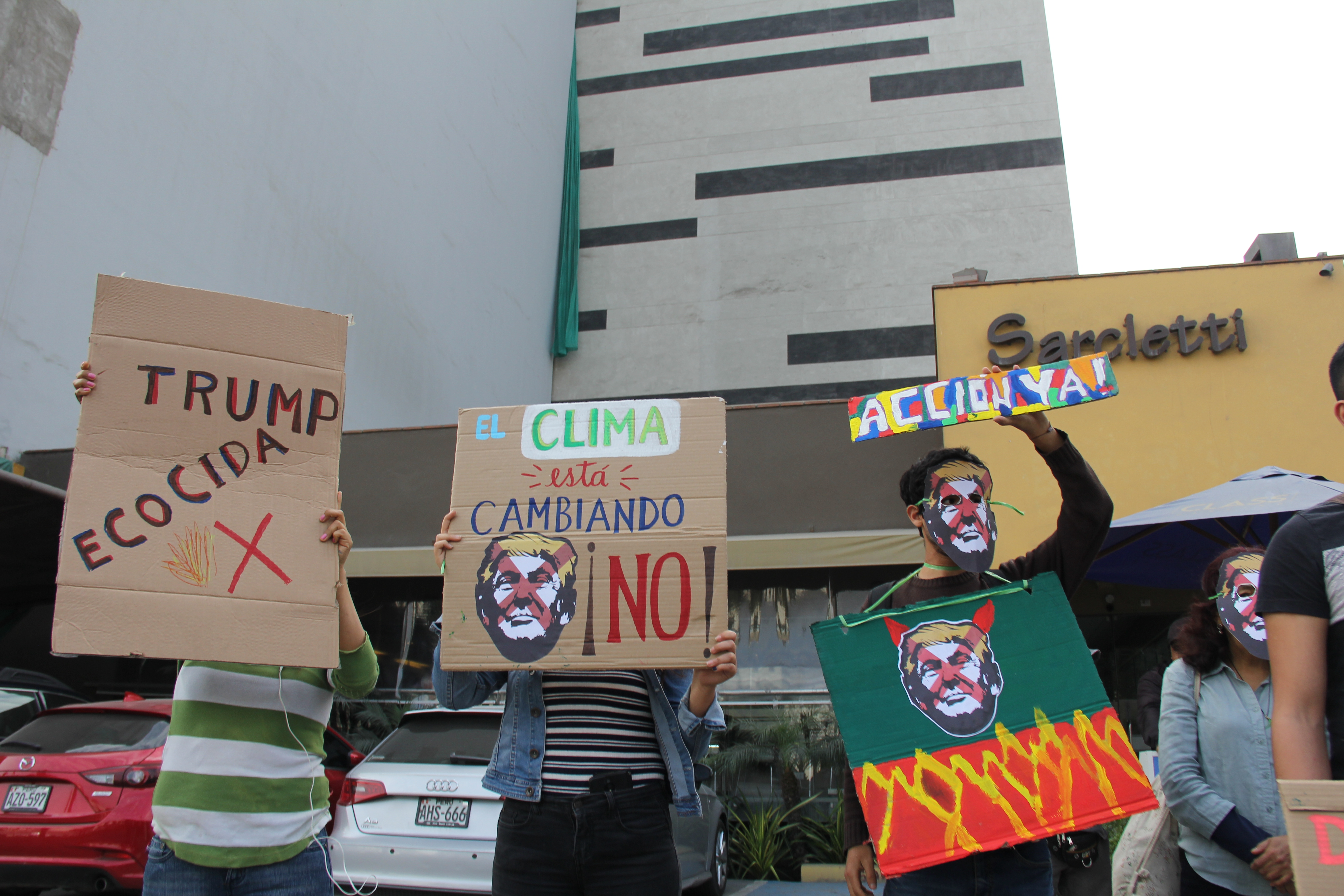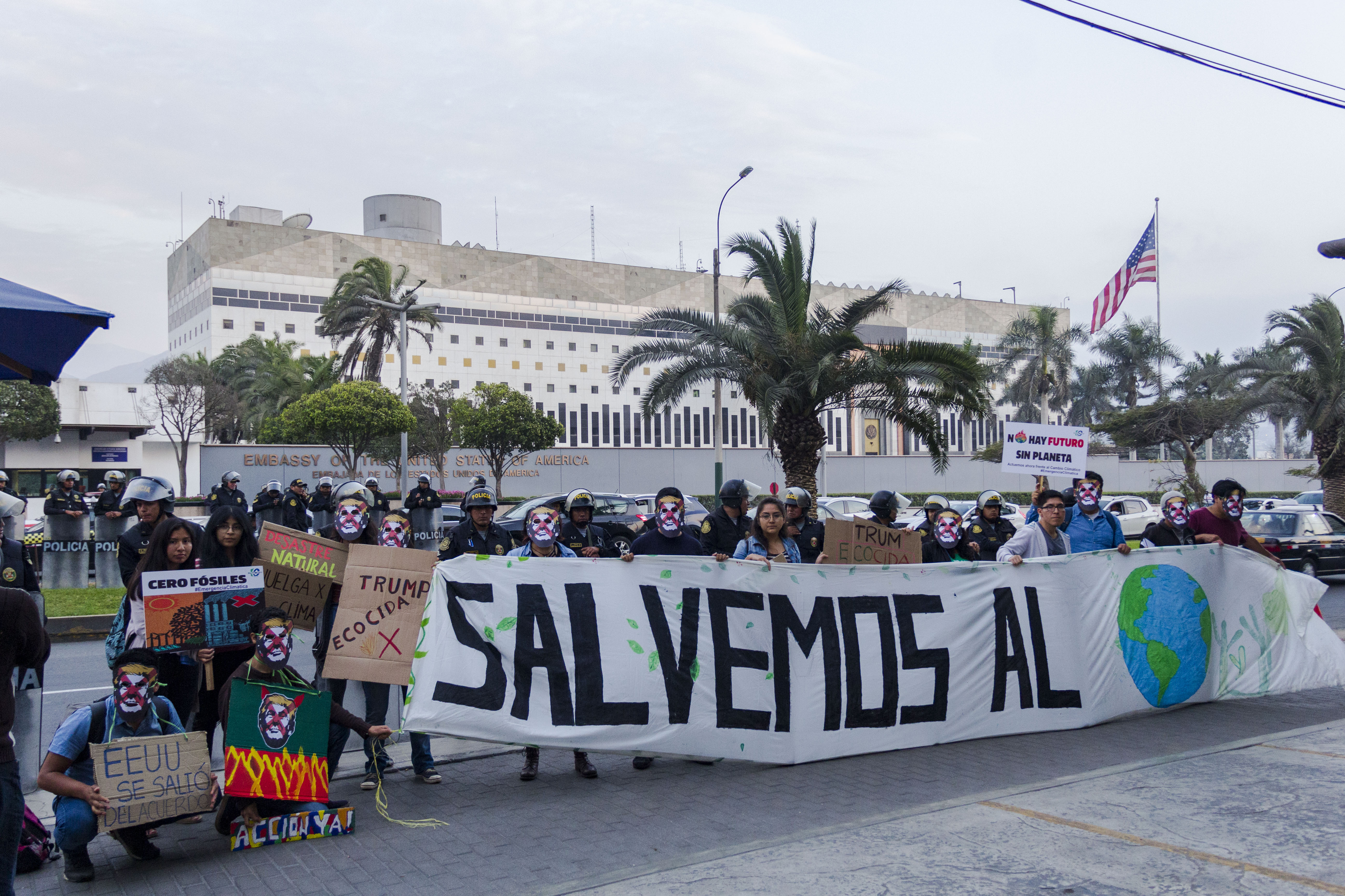 Fueron 30 activistas que se movilizaron al ingreso de la embajada de EE.UU. en surco con máscaras de Trump y con frases como «Trump, ecocida, respeta los acuerdos climáticos» o «EE.UU. se saltó el acuerdo». Los activistas estuvieron 3 horas plantados frente a la institución hasta la llegada de la Policía Nacional. Esta acción es una respuesta a la decisión de parte de dicho país de retroceder en sus compromisos para la reducción de emisiones de carbono en la atmósfera.