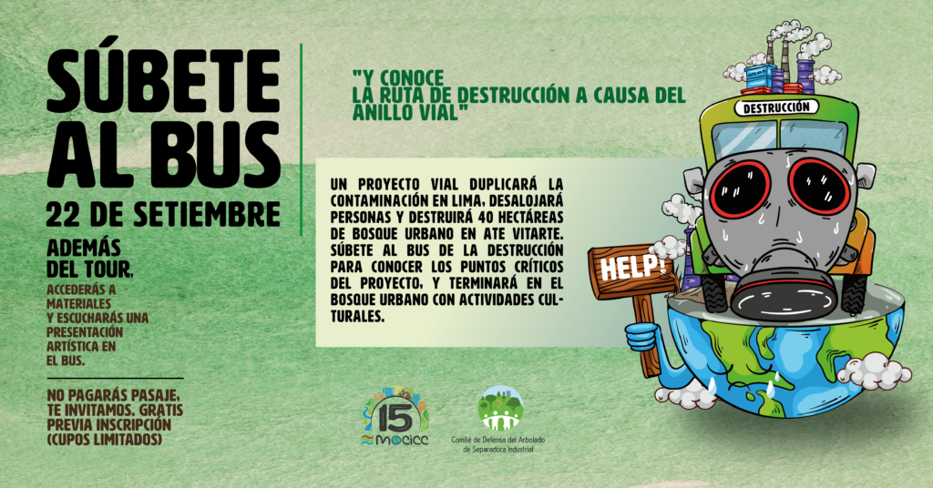Durante la jornada cultural, podrás disfrutar de actividades que combinan arte, educación y acción ambiental. Además, te invitamos a subir al Bus de la Destrucción, donde podrás realizar un tour por los puntos críticos del proyecto AVP y conocer de primera mano cómo afectará a diversas zonas de Lima.